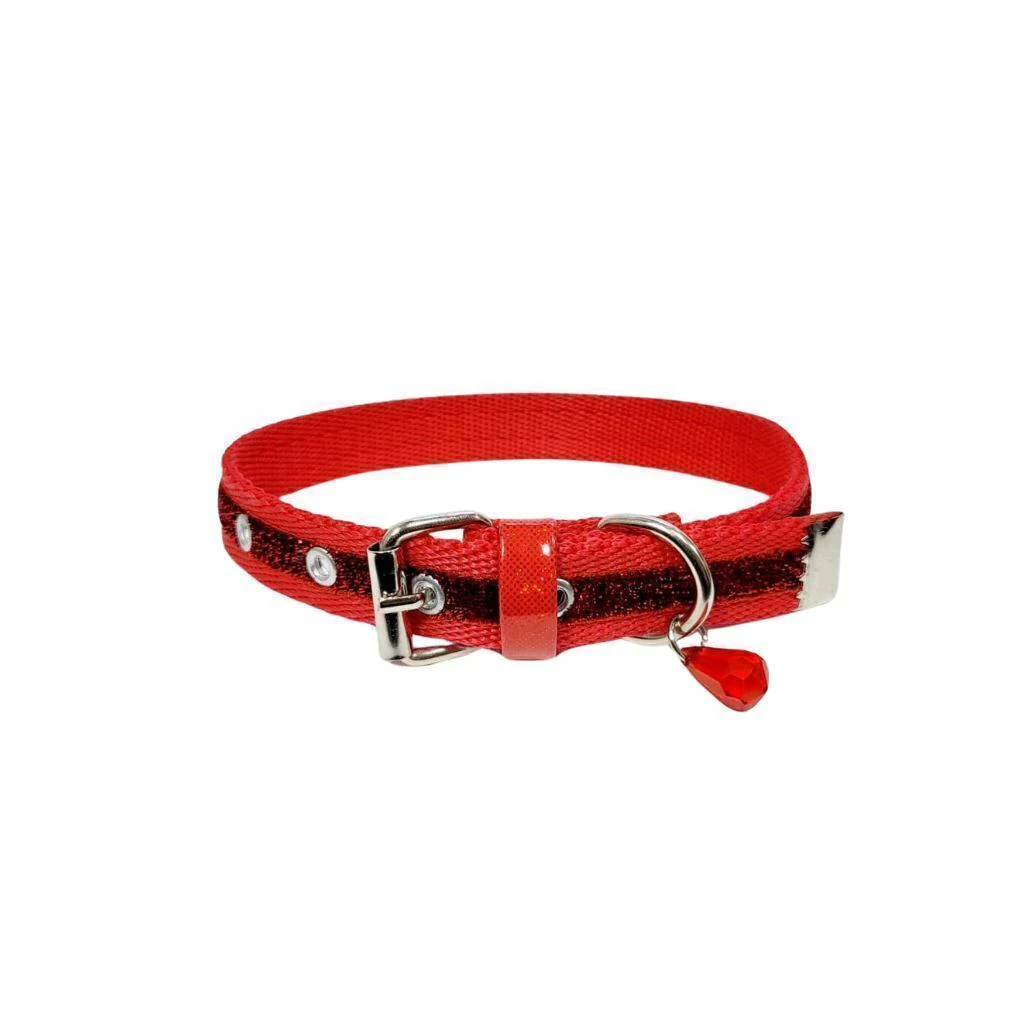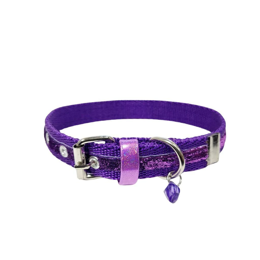 Collar de nylon con una cinta de tela brillosa en el medio y a lo largo del mismo. Posee un dije de acrílico.