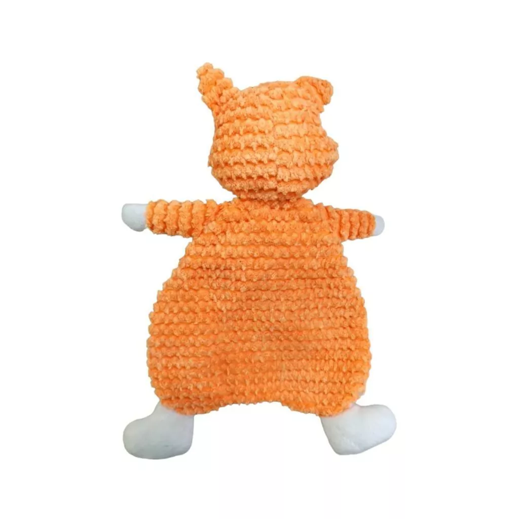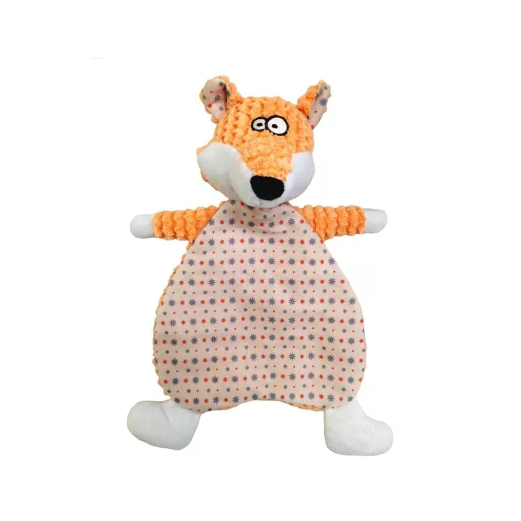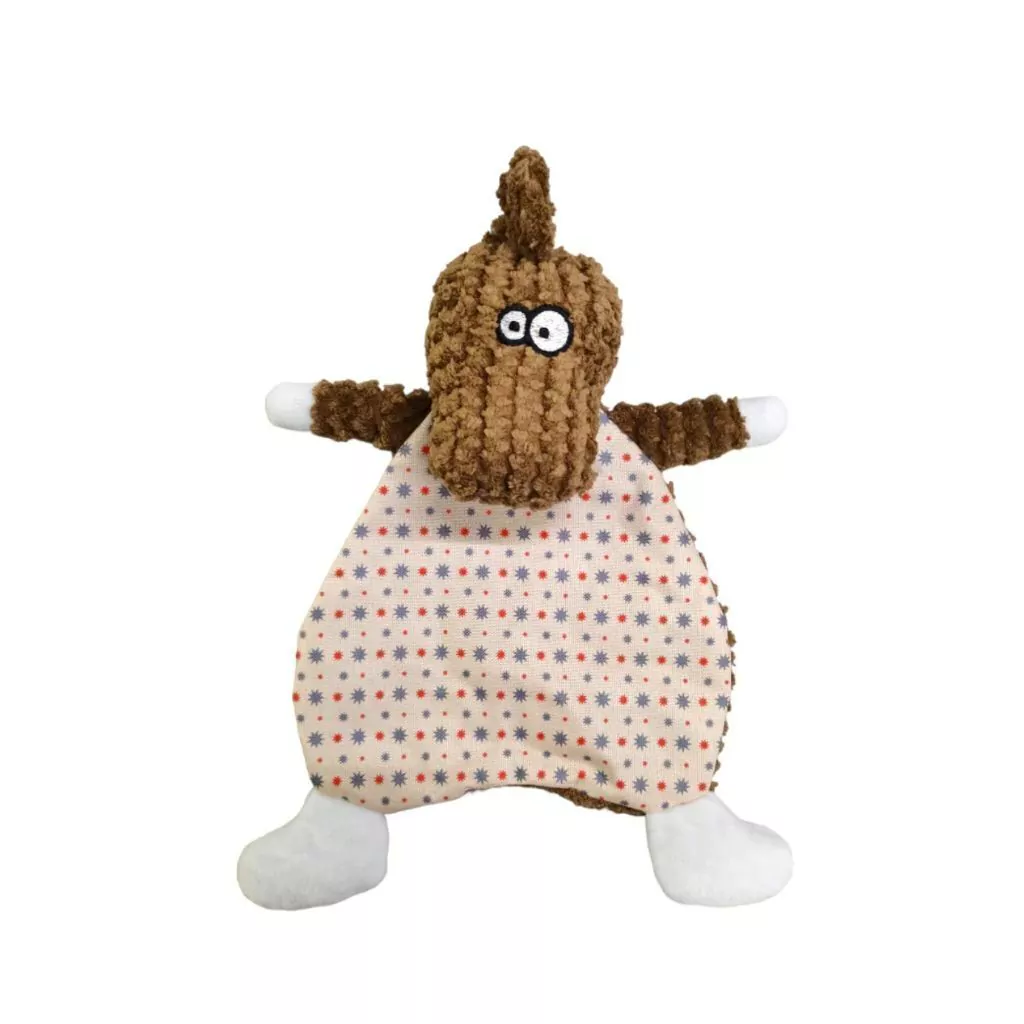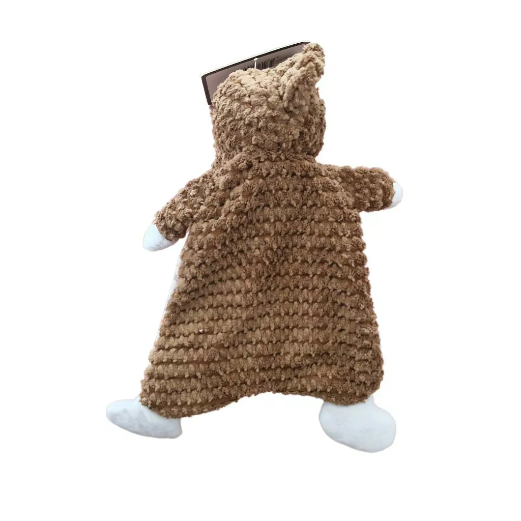 Es un animalito de material suave (tipo toalla) con tela antidesgarro en la parte del frente (panza y las orejas).