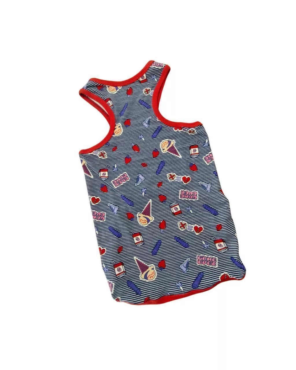 Remera sin mangas de algodón elastizado rayado azul y blanco con estampa en toda la tela.