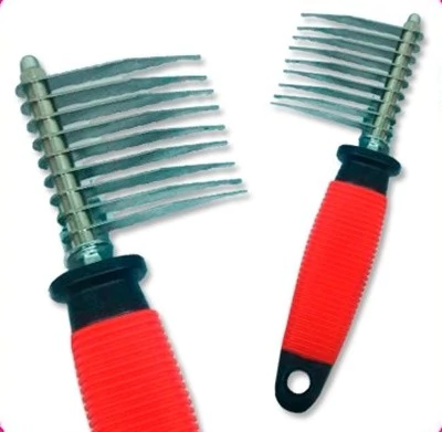 Peine sacanudos para mascotas. Sus dientes poseen filo, lo cual facilita el corte de los nudos indeseados en el pelaje de la mascota. Se utiliza peinando al animal en forma lateral.