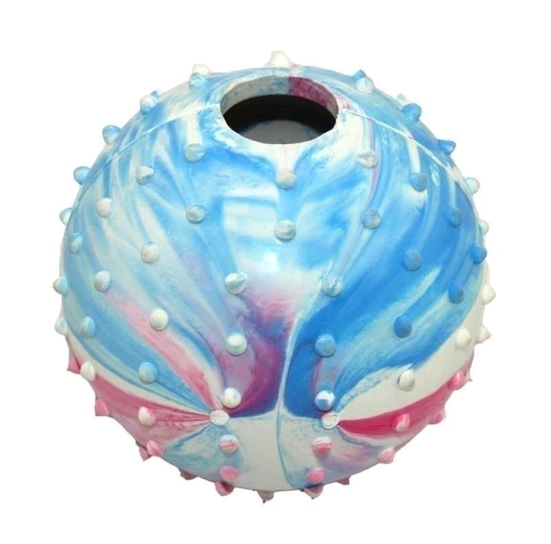 Pelota de caucho resistente con pequeñas protuberancias que le dan una textura más agradable al masticar.