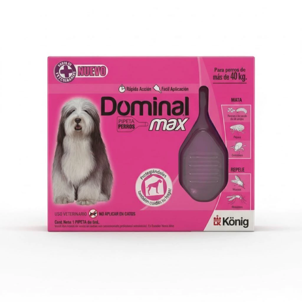Dominal MAX Perros es una solución pulguicida y garrapaticida de aplicación tópica para perros que suma el efecto ambiental. Dominal MAX Perros contiene Imidacloprid, Permetrina y Fenoxicarb. El Imidacloprid se caracteriza por su gran poder de volteo, responsable de la eliminación del 100% de las pulgas dentro de las 24 horas post aplicación. La Permetrina le otorga el poder garrapaticda. El Fenoxicarb le otorga poder residual, debido a su acción análoga a la de las hormonas juveniles de la pulga, impidiendo la maduración de huevos y larvas, eliminándolas del ambente sin recurrir a productos adicionales. Dominal MAX Perros protege de las reinfestaciones por pulgas y garrapatas.